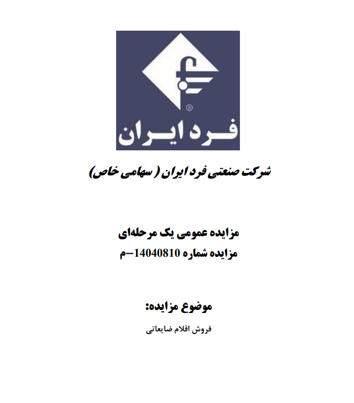 شرکت صنعتی فرد ایران (سهامی خاص) در نظر دارد نسبت به فروش اقلام ضایعاتی از طریق مزایده عمومی یک مرحله ای مندرج در اسناد مزایده به شرح ذیل